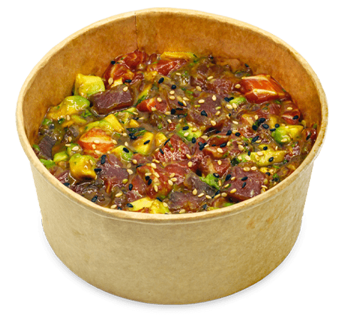 Atún rojo y salmón, aguacate, salsas de la casa especiales.